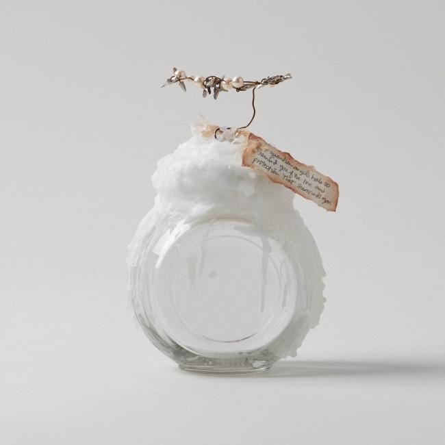 A wire halo, embellished with stars and natural pearls, rises above a circular glass bottle. Filled with cotton “clouds”, this talisman makes us think of an old-fashioned snow globe. The top is hand-dipped in sealing wax, with a handwritten antiqued tag reads, ìYour Guardian Angelís halo to remind you of the love and protection that surrounds you.”